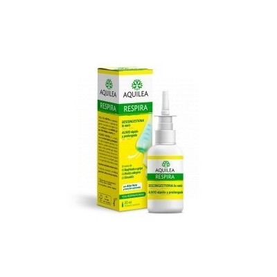 Aquilea Respira es un producto sanitario indicado en casos de congestión nasal provocados por procesos patológicos, como resfriado, gripe, rinitis alérgica, sinusitis, etc. Aquilea Respira es un espray nasal de efecto rápido y prolongado. Su solución salina hipertónica con Aloe Vera y esencias naturales despeja la nariz y contribuye a disminuir la inflamación de las mucosas. Los aceites esenciales BIO de eucalipto y abeto balsámico contribuyen a prolongar el efecto de alivio y frescor. No produce adicción ni efecto rebote.